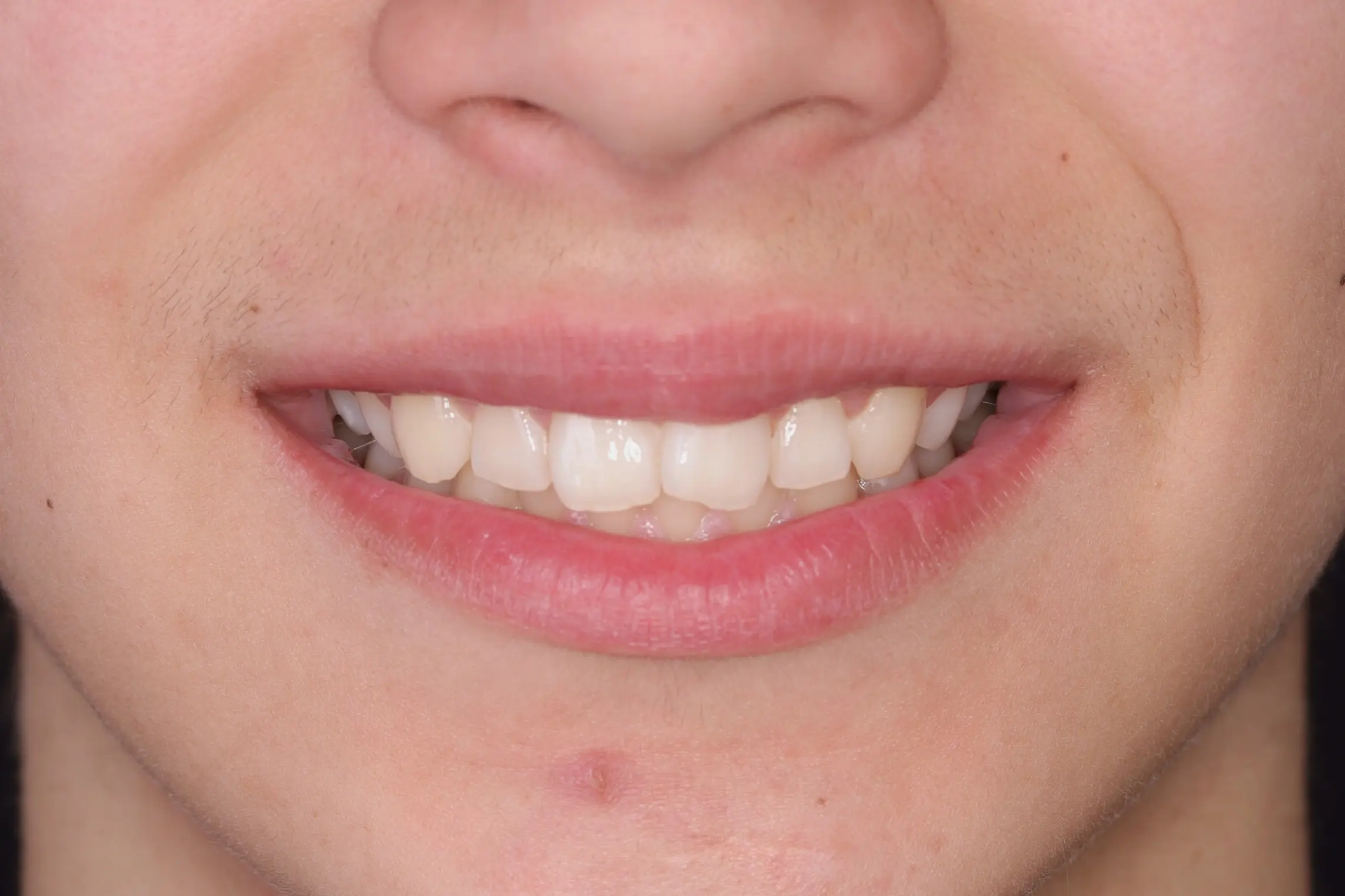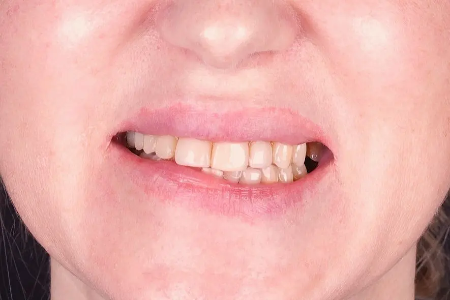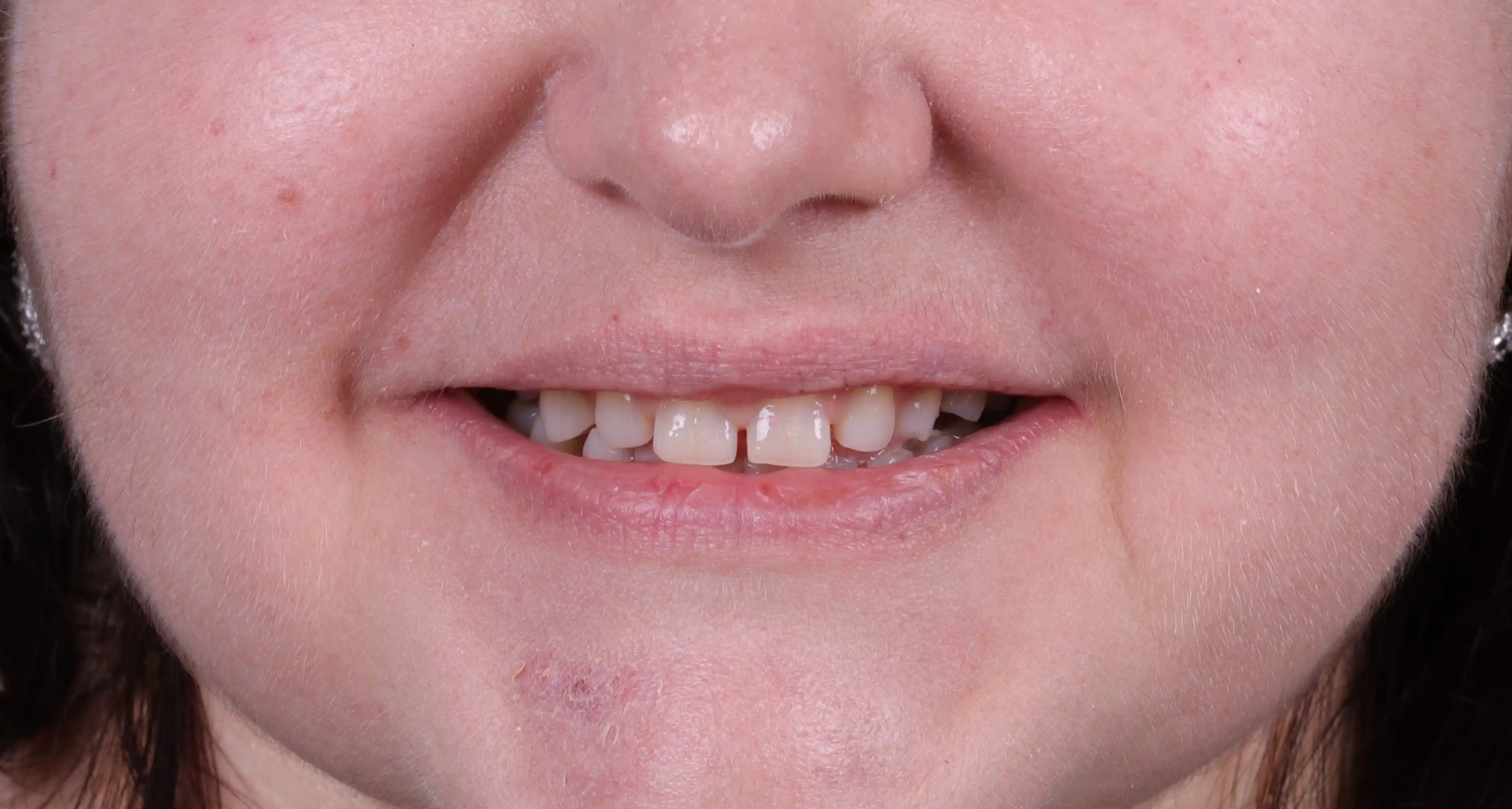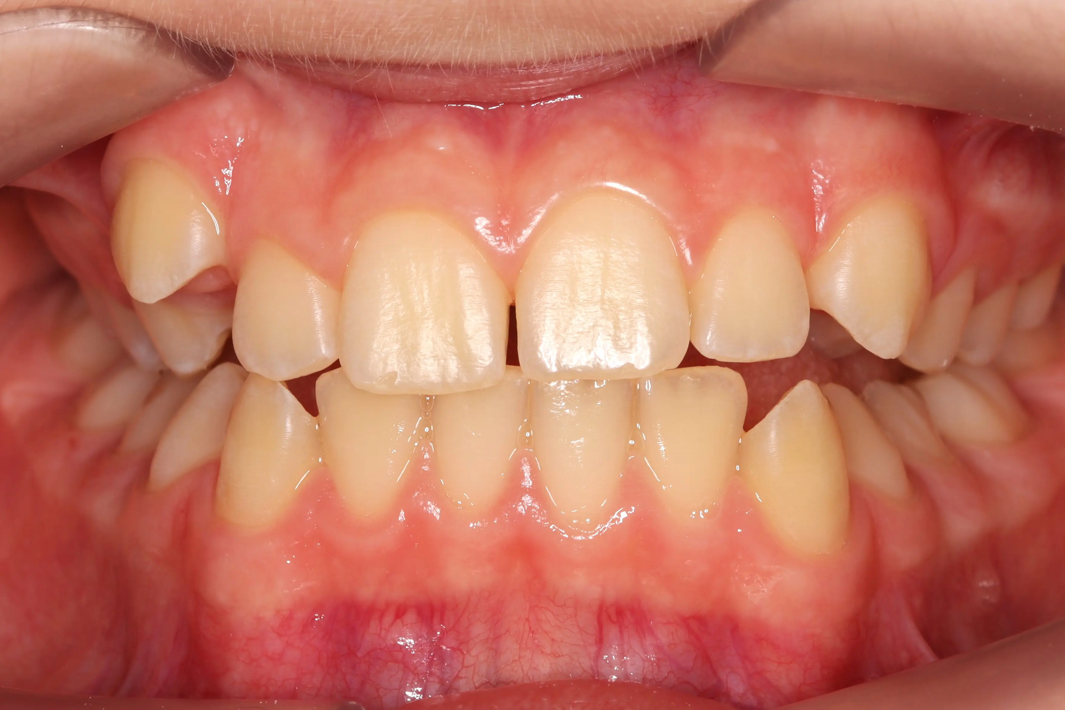 Асиметричний дефіцит місця у ділянці верхнього правого ікла сформувався внаслідок зміщення бічного сегменту вперед. Це призвело до скупченості зубів як на верхній, так і на нижній щелепі та порушення гармонії посмішки.